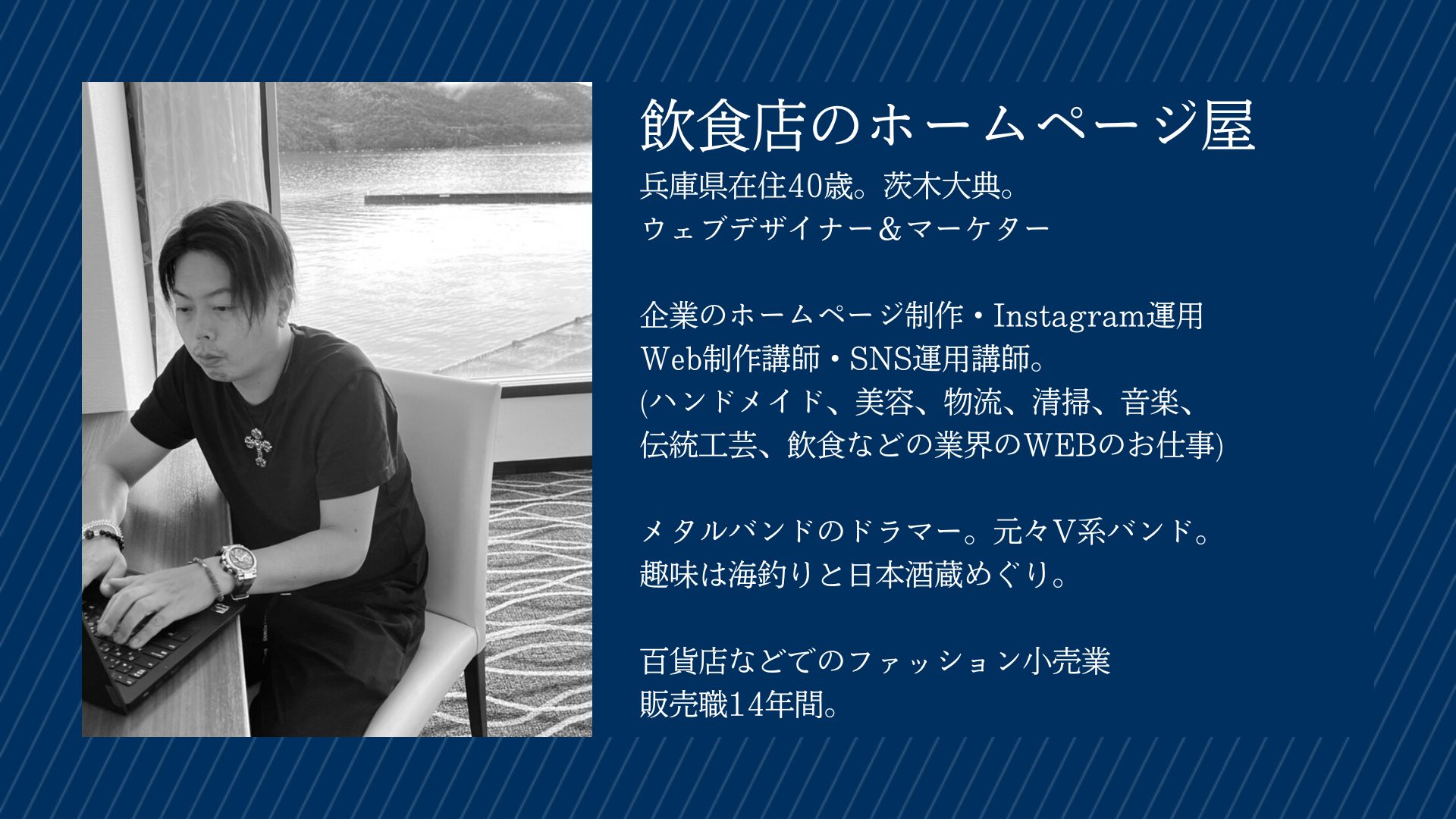 兵庫県明石市にてホームページ制作・ホームページ制作せミナーを実施しております。兵庫県明石市在住の茨木大典と申します。1982年生まれの42歳男性です。